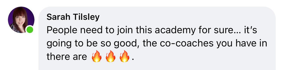 Couple this with the opportunity to join the Academy this time as one of the first 50 founding members and therefore be granted the unique opportunity to become a Co-Coach for the Academy....